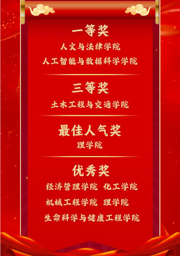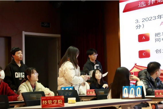 决赛环节,来自人文与法律学院、人工智能与数据科学学院、土木工程与交通学院、经济管理学院、生命科学与健康工程学院、理学院、化工学院、开云官方网页版官网的8组选手,通过必答题、抢答题、风险题、一题决胜等环节进行激烈角逐,现场300余名观众积极参与,气氛热烈。