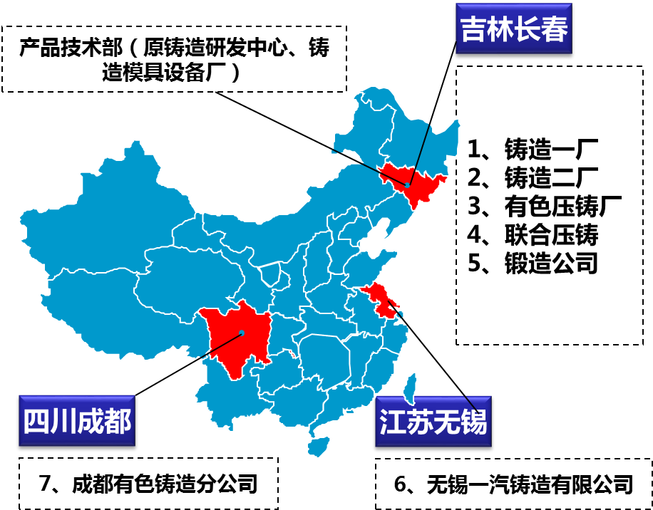 1999年3月12日由铸造厂、铸造二厂、精铸厂、铸模厂组成的一汽铸造有限公司成立。历经六十余年的发展,现已形成“三地七厂一中心”的产能布局,目前拥有5个分公司、1个全资子公司、1个参股公司,分别是铸造一厂、铸造二厂、有色铸造分公司、成都有色铸造分公司,无锡一汽铸造有限公司,一汽锻造(吉林)有限公司、长春一汽联合压铸有限公司。一汽铸造已经成为国内最大的汽车铸锻件生产基地之一。
