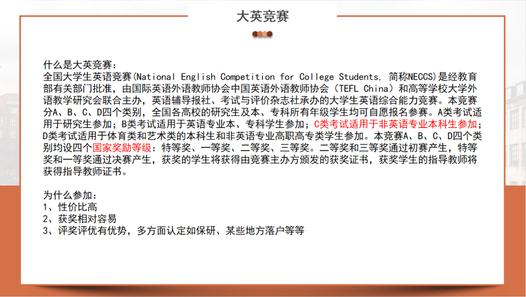 第二部分是王亚鹏同学对于英语竞赛及四六级考试的经验分享。王亚鹏同学为大家讲述了四六级和英语竞赛的考试安排,考前备考建议以及各种题型的应试技巧。绘声绘色的讲解让即将参加四六级考试的同学们能够有更好的考前准备,也能让同学们在英语竞赛考试中能取得更出色的成绩。