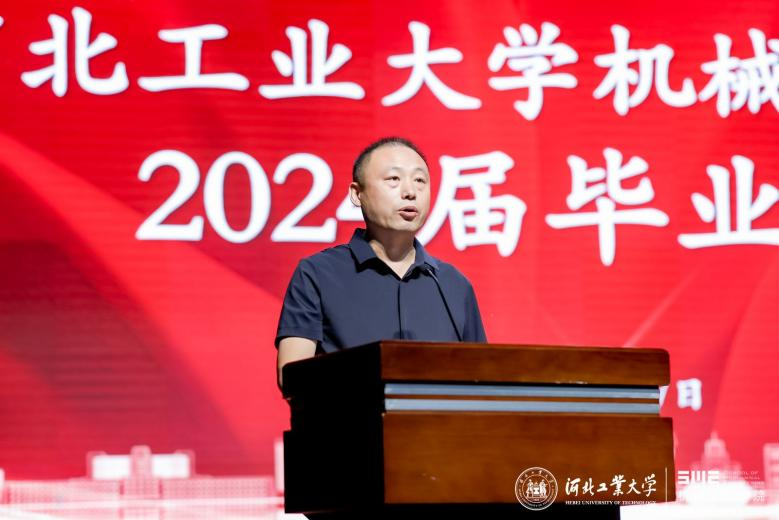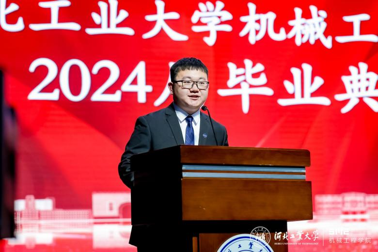 校友代表机电954班母彩军表示毕业晚会是同学们共同回忆和展望未来的时刻,愿学弟学妹们勇敢迎接挑战,实现梦想,成为社会的栋梁之才,河北工业大学天津校友会机械分会欢迎同学们的加入。