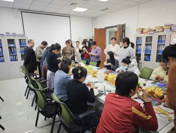 活动现场,老师们暂时放下繁忙的教学与科研工作,围坐一起,一边品尝香甜可口的茶点,一边话家常、聊生活、交流工作心得。在扭扭棒手工制作环节,大家兴致勃勃,一根根柔软的扭扭棒,在老师们灵巧的双手中,经过弯折、缠绕、塑形、组合,逐渐变成了一朵朵形态各异、栩栩如生的手工花,每一件作品都充满巧思与温情。老师们互相请教制作技巧,分享创作灵感,从生疏尝试到熟练操作,沉浸式体验手工创作的乐趣,用巧手“扭”出永不凋零的花朵,也定格下属于自己的节日浪漫。
