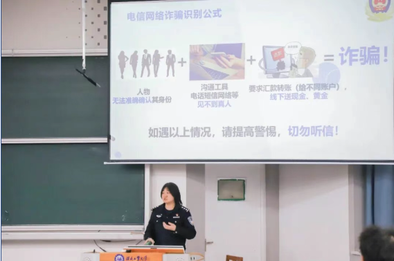 讲座中,陈玥警官用通俗易懂的语言,讲解了当前高发诈骗类型,重点剖析刷单返现、虚构色情服务、网络游戏虚假交易等典型手段。结合发生在学生身边的真实案例,还原诈骗分子作案流程,揭露其套路与隐蔽性、危害性,引导师生认清侥幸心理和防范意识薄弱带来的风险。为帮助同学们快速掌握反诈技巧,陈玥警官还总结了“七个提示”,叮嘱大家牢记践行,筑牢反诈思想防线。