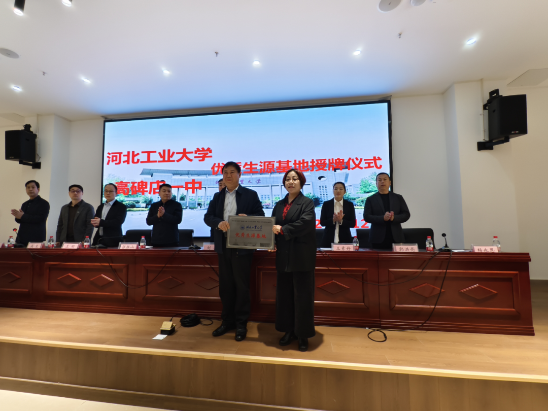 杨占力书记向高碑店一中授予“优质生源基地”牌匾,并签署了优质生源基地协议书。他表示:期待高碑店一中为河北工业大学输送更多优秀学子,勉励学生秉承家乡优良传统,珍惜时光,树立远大理想,全面提升自我,努力成为推动科技进步、社会发展和民族振兴的栋梁。