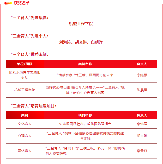 为全面贯彻立德树人根本任务,切实提升新形势下高校思想政治工作质量,调动广大教职员工全员全过程全方位育人的积极性,学校开展“三全育人”先进集体、先进个人、优秀案例和培育建设项目评选活动,开云官方网页版官网积极组织学院教师申报,经学校评审获奖名单如下: