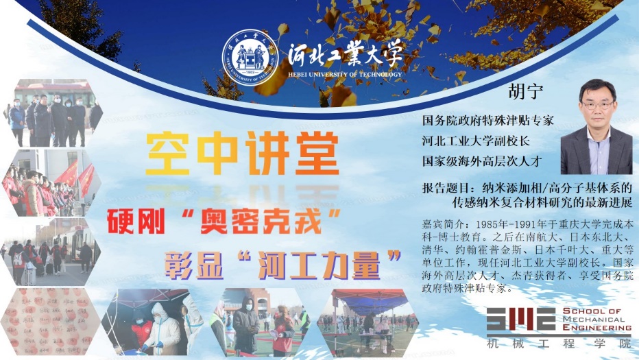 1月20日,空中讲堂系列活动第一讲主讲嘉宾为河北工业大学副校长胡宁教授,报告题目为“纳米添加相/高分子基体系的传感纳米复合材料研究的最新进展”。