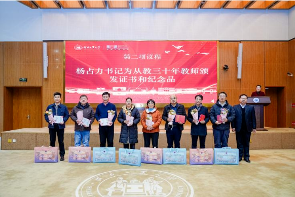 紧接着,党委书记杨占力为从教三十年的教师们颁发了荣誉证书和纪念品。于文英老师作为代表讲话,她深情回顾了自己的教育生涯,表达了对教育事业的热爱和对未来的美好期待。