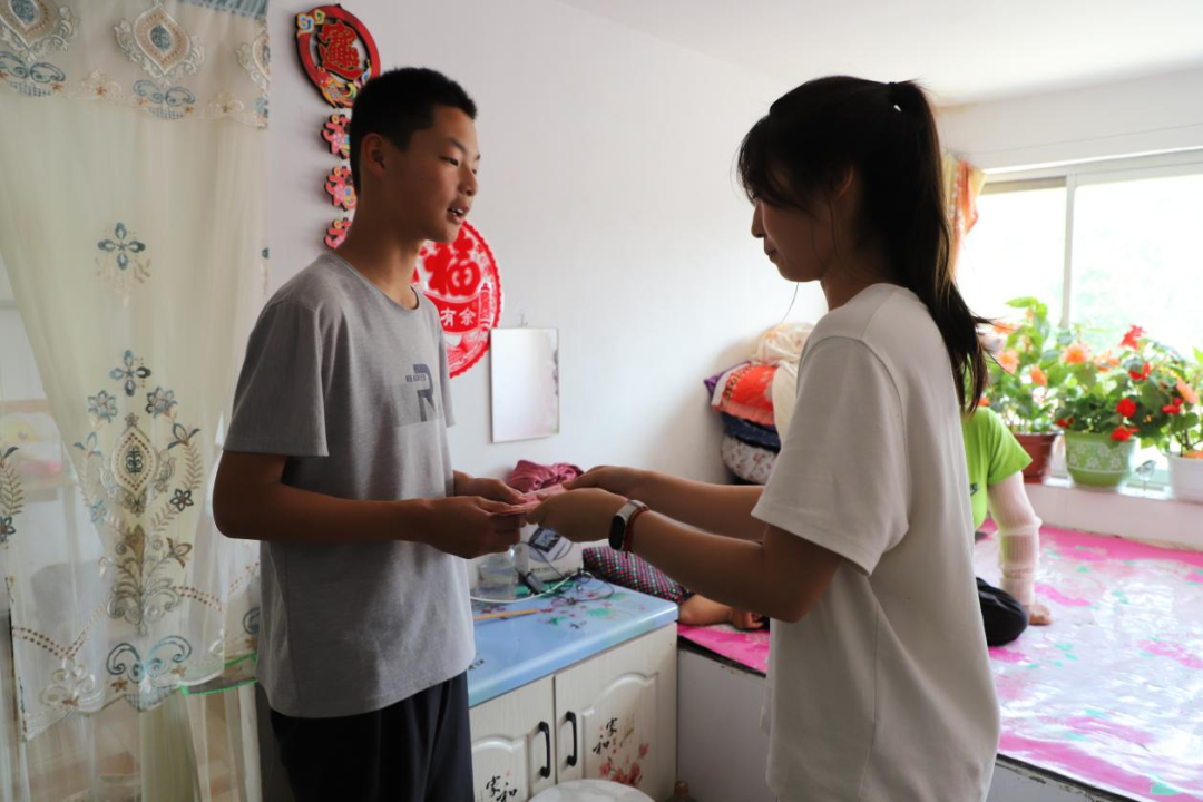 孩子们作为义务领路的小向导,带领实践队员一早走访了水泉村第一组、第五组与第七组村民。每到一户,家中的老人、孩子都热切地迎上来,拿着提前洗好的水果热情的招待。再见到时隔许久的帮扶对象,实践队员亲切地与之握手交谈,了解他们的生活学习情况,并为孩子们送上助学金,希望通过我们的微薄之力帮助孩子们解决困难,激励他们好好学习。